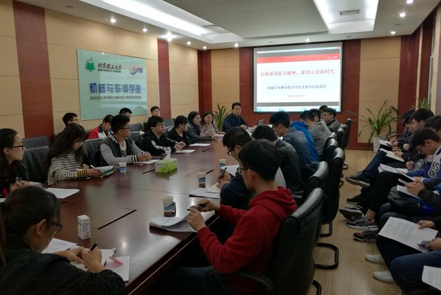 为了贯彻落实传达学校“弘扬爱国奋斗精神,建功立业新时代”主题活动推进会的会议精神,在学生党支部中迅速落实和布置工作要求和任务,机械与车辆学院党委于10月15日晚7点,在1号楼233会议室召开了学生党支部书记重点工作推进座谈会,学院领导、学生党建组织员、全体研究生以及本科生党支部书记30余人参加了会议。