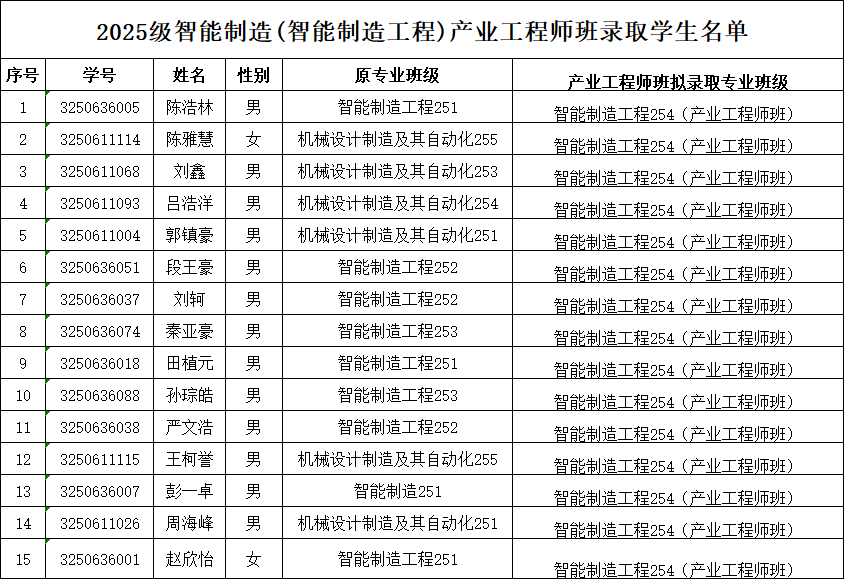根据学校2025级产业工程师班学生选拔工作安排,经学生申请,学院资格审查并组织面试后,拟同意陈浩林等15名同学入选2025级智能制造工程(产业工程师班)。现将具体名单予以公示如下。
