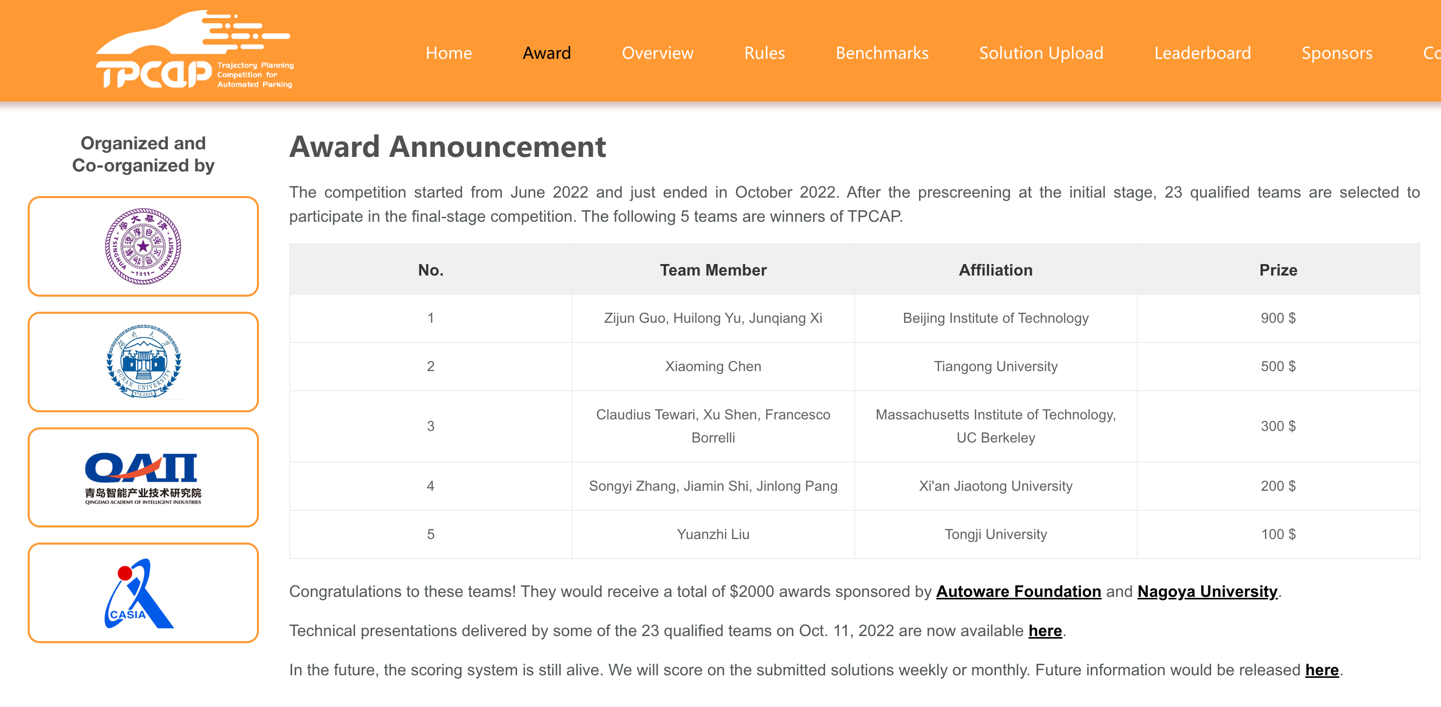 2022年10月11日晚10时,TPCAP组委会组织了线上颁奖典礼以及技术研讨会。在研讨会中,包括北京理工大学代表队在内的12支决赛队伍自愿进行了技术分享。