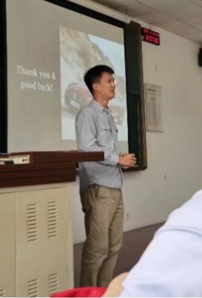 现任职于梅赛德斯奔驰的2011级校友时渝杰学长介绍了自己在校期间的学习与课业发展经历,以及在德国的访学交换及读研故事,通过对比现在工作中的实际工作内容及在校期间所学专业知识,对工业工程专业做了深入浅出的介绍,也为同学们的国际化发展及未来目标设定提供了建议。
