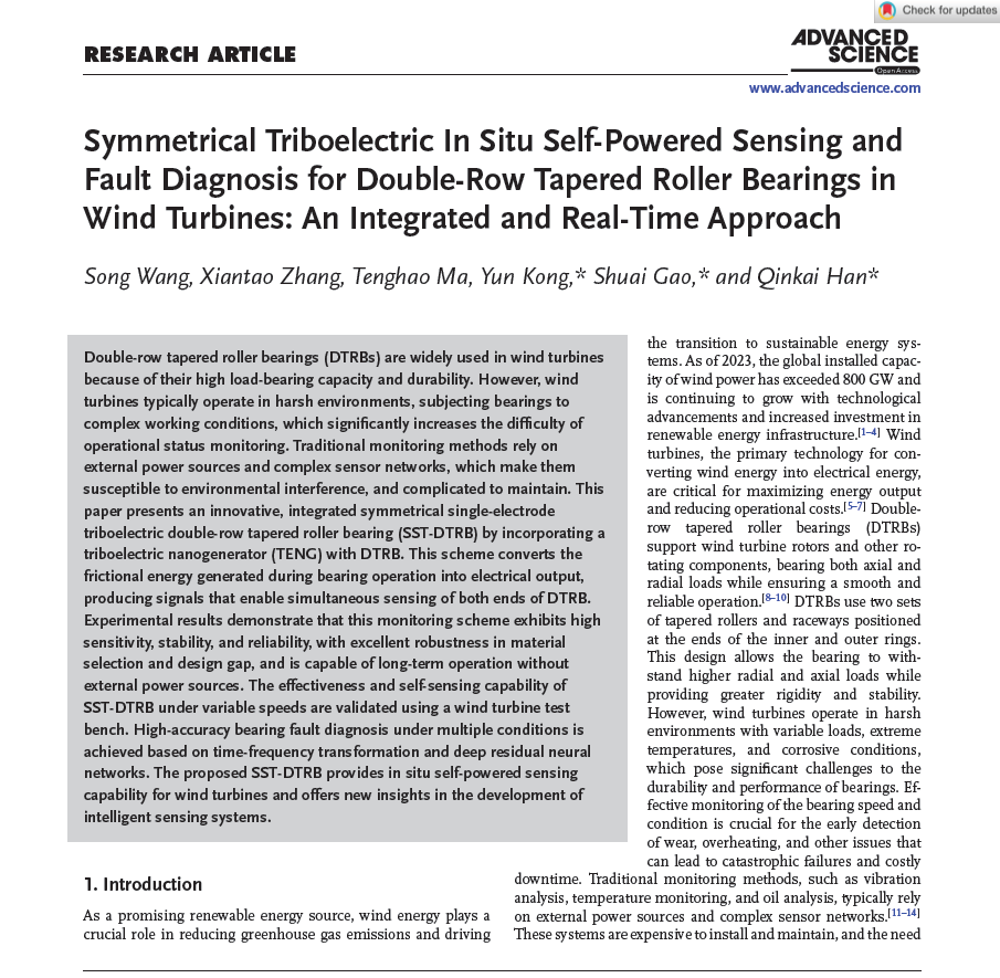 近日,北京理工大学机械与车辆学院孔运副教授,联合清华大学、重庆大学等单位,在国际顶级期刊《Advanced Science》公开报道了一种对称单电极式摩擦电智能轴承(SST-DTRB),巧妙设计了摩擦纳米发电机与双列圆锥滚子轴承的智能集成样机,实现了风力发电机双列圆锥滚子轴承的原位自供能状态感知与智能故障诊断,突破了微纳发电、能量采集和智能状态感知于一体的智能结构集成设计技术。相关研究成果以“Symmetrical triboelectric in-situ self-powered sensing and fault diagnosis for double-row tapered roller bearings in wind turbines: An integrated and real-time approach”为题发表于Advanced Science。北京理工大学孔运副教授、清华大学韩勤锴副研究员、重庆大学高帅教授为本文共同通讯作者。